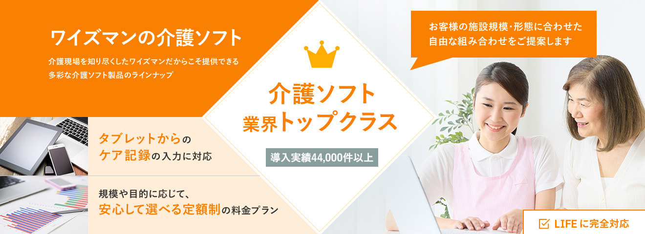 介護現場を知り尽くしたワイズマンだからこそ提供できる多彩な介護ソフト製品のラインナップ。タブレットからのケア記録の入力に対応。規模や目的に応じて安心して選べる定額制の料金プラン。お客様の施設規模・形態に合わせた自由な組み合わせをご提案します。