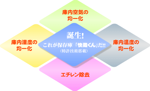 「快蔵くん」は、庫内に特許技術によるエチレン除去パネルを組み込んだ《循環ダクト》と《超音波加湿器》を搭載。